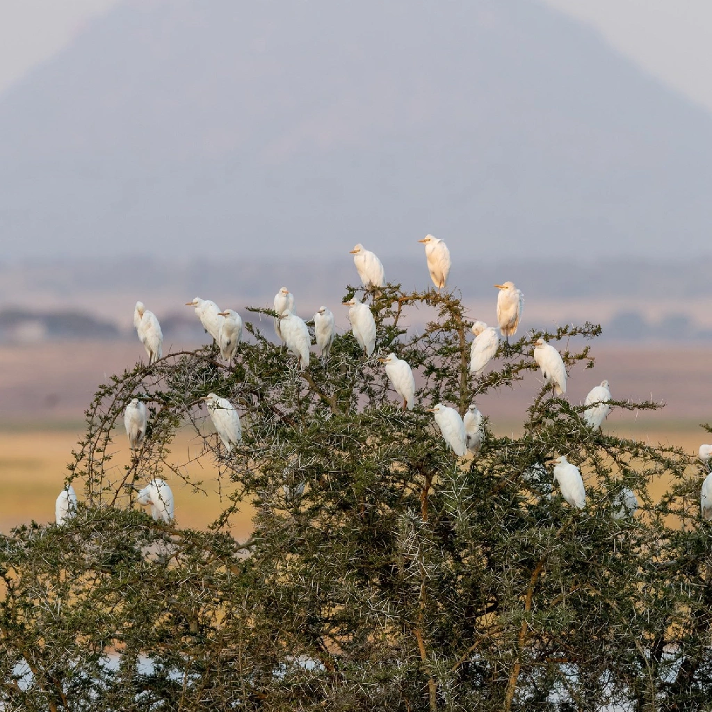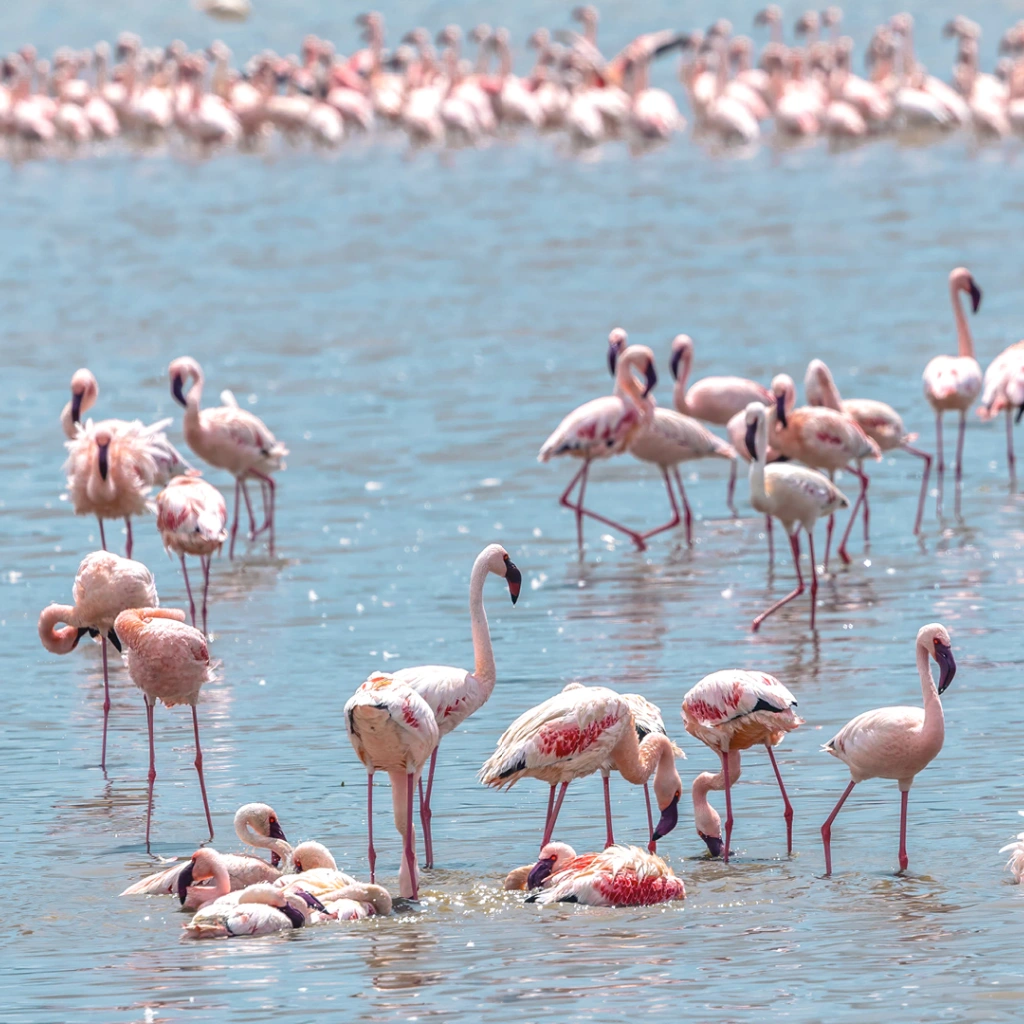 Enjoy a guided walking safari with a park ranger, offering the chance to spot birds like the Silvery-cheeked Hornbill, Abyssinian Crimsonwing, and a variety of waterfowl on the lakes, including thousands of flamingos.